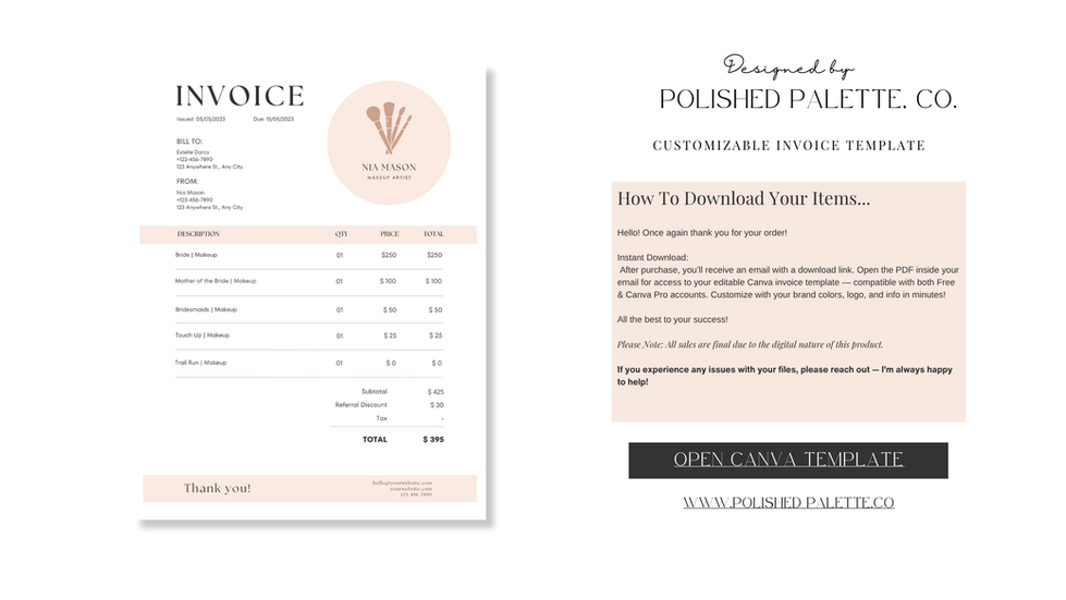 Select your preferred invoice template design and complete your purchase directly through the Polished Palette, Co. online shop.